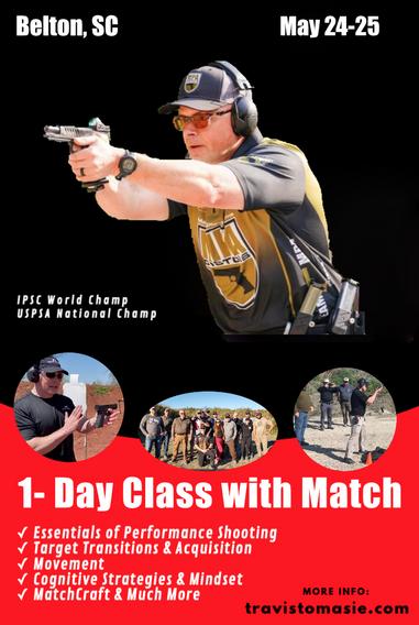 1-Day Performance Pistol Class with Match. This is a unique opportunity to train for a day with Travis, and then shoot a match with him.